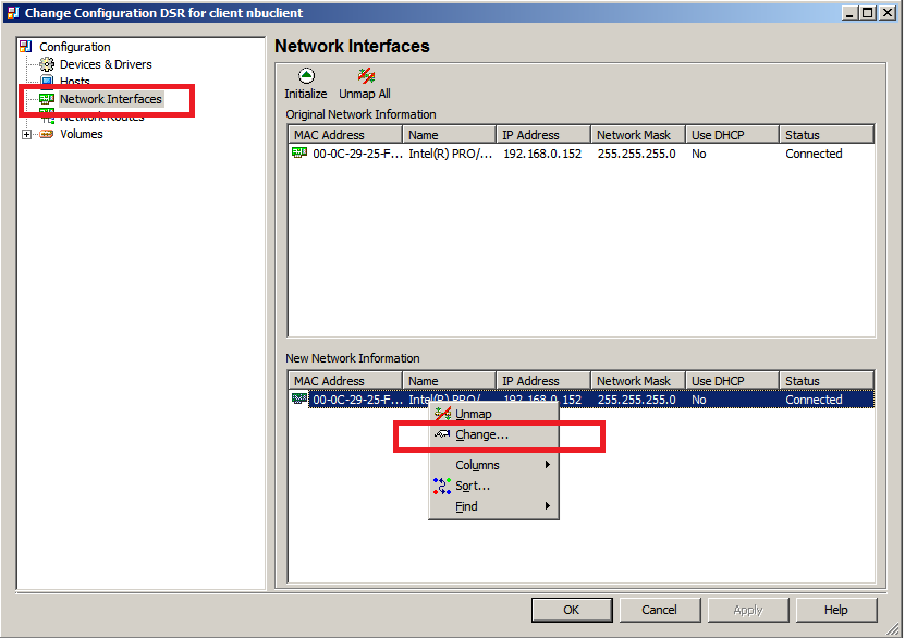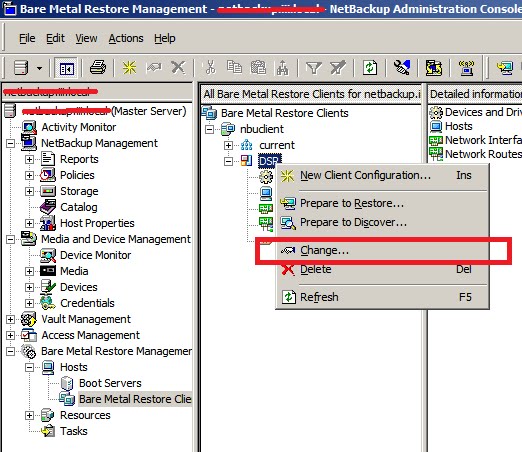 If you have both option enabled on a backup policy, backup client will be displayed on Bare Metal Restore client after a completion of Full backup. Right click on a client which is currently down and select a new client configuration.