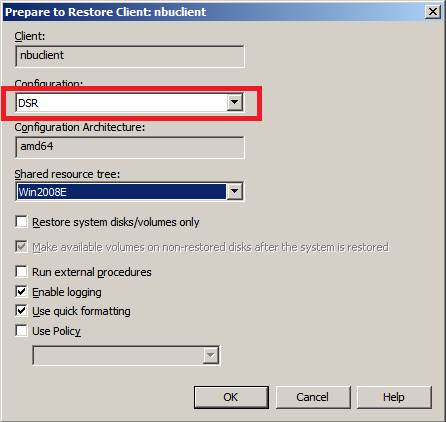 Scroll down and select the DSR configuration, shared resource tree and then click ok, shared resource tree must be created before restoring, that should match with architecture of a machine ie 64 bit as per below configuration.