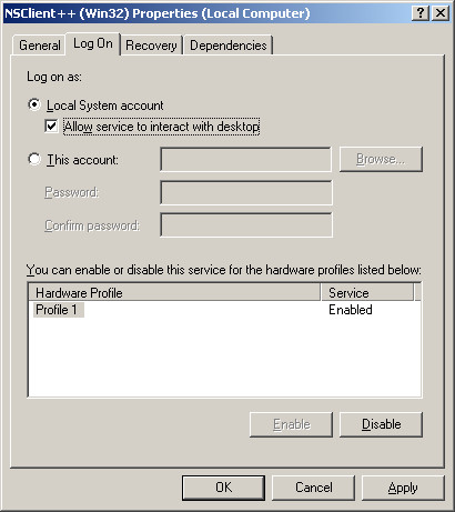 7. Go to the Run —> services.msc —> NSClient++ service —> Logon —> Allow service to interact with desktop.